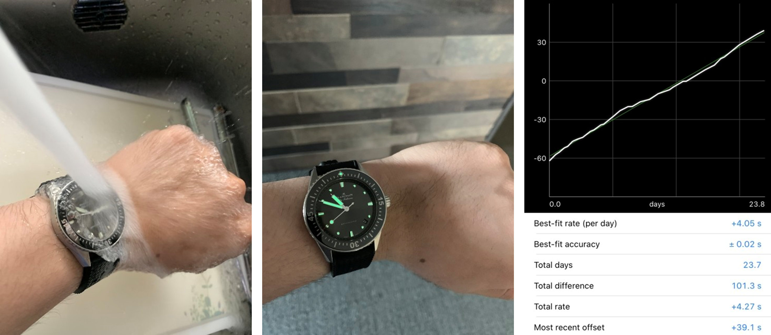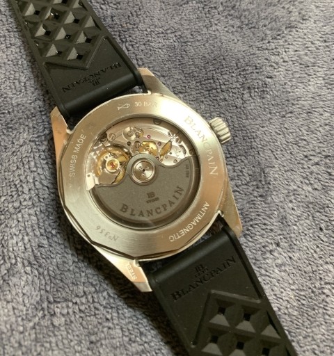물론 빅5 드레스워치나 그랜드세이코 / 더 시티즌 등 브랜드에서 보여주는 마감과 직접적인 비교를 하기에는 무리가 있다. 다만 롤렉스, 오메가, IWC 등의 프레스티지 브랜드, 나아가 소위 하이엔드 브랜드라 불리는 브랜드의 엔트리 시계급에서는 명성이 무색해지는 마감미흡, 단차, 유격 등을 보이는 경우가 왕왕 있는데 적어도 블랑팡 바티스카프는 그런면에서는 면죄부를 받을 수 있는 모델이라 할 수 있다. 핸즈홀 중심 불일치, 프린팅글자 및 초침도색 번짐 등 미스도 보이지 않았고, 뒷백에서도 기본적인 제네바스트라이프와 앵글라쥬 처리에서 흠잡을 곳은 없었다. 그야말로 기본에 충실한 모델