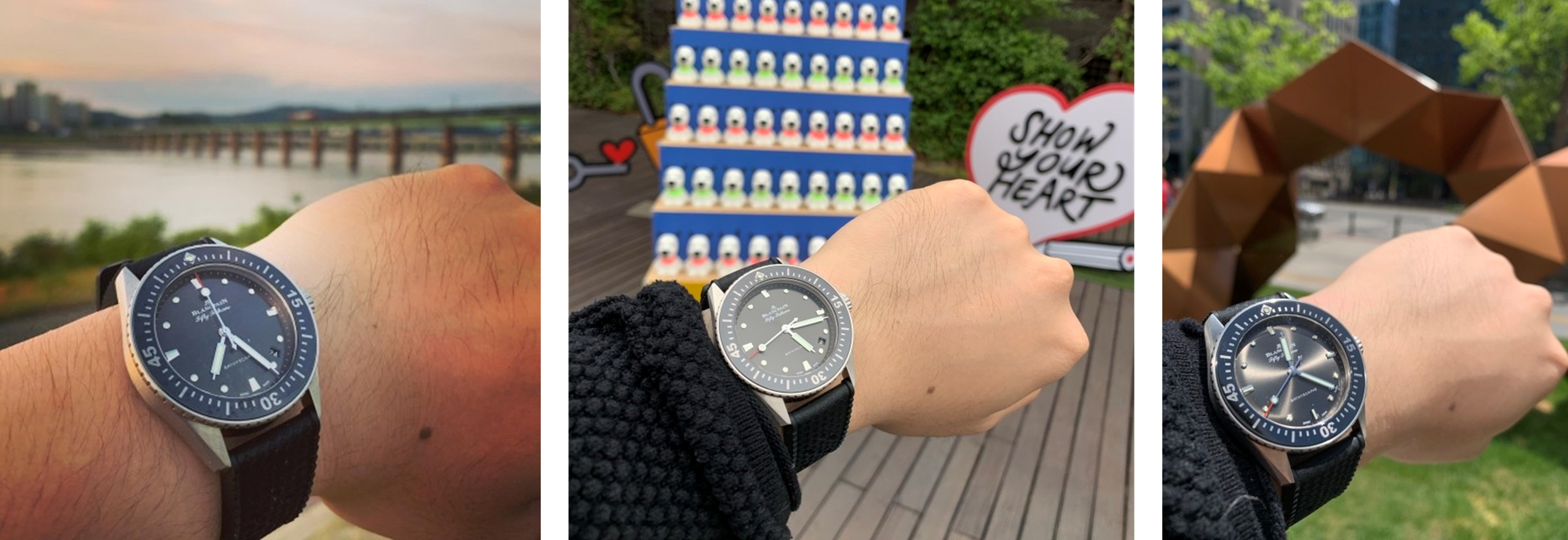 사실 피프티패텀즈는 최초의 상용화된 근대식 다이버시계라는 점에서 그 상징성이 있고, 블랑팡이라는 브랜드 자체가 내게는 호감이었기에 좋은 인상이 있던 모델이었다. 다만 기본 사이즈가 45mm로 내겐 너무 컸고 처음 명제인 '존재감이 너무 튀지 않고 나를 받혀줄 데일리 시계'를 찾는 목적에는 부합하지 않아 아예 배제하고 있었는데, 우연히 들린 매장에서 이 바티스카프를 처음 본 후 한눈에 반해버렸다.