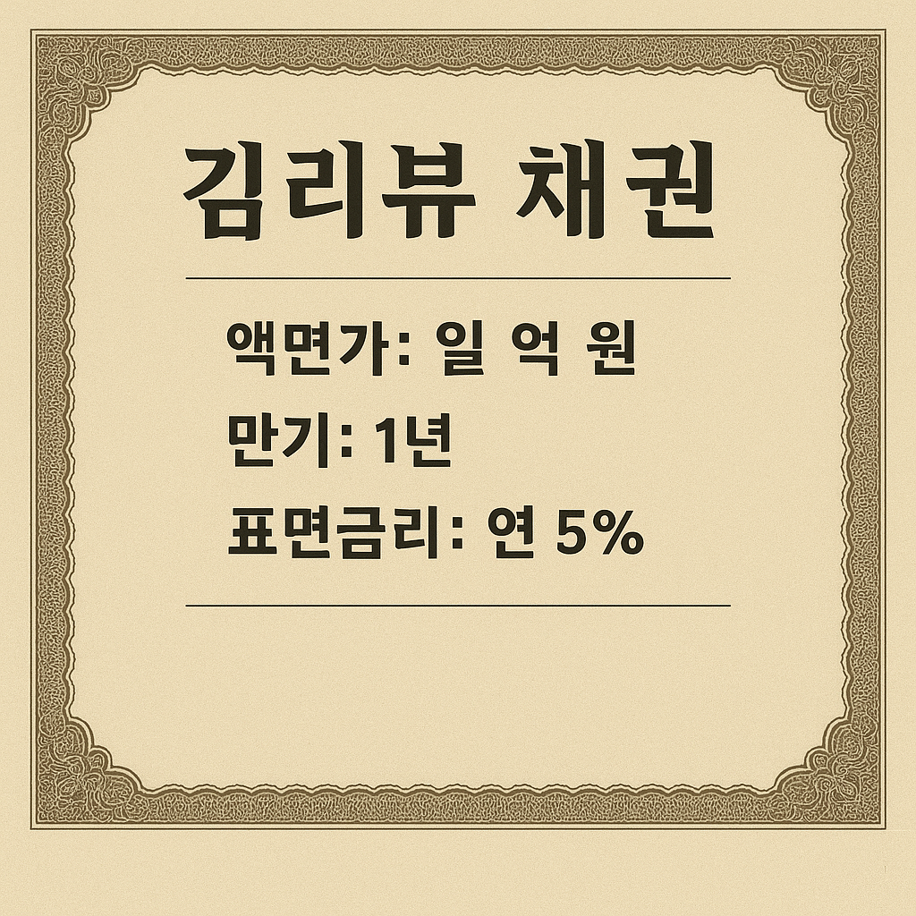 액면가 - 김리뷰가 만기일에 갚아야 할 원금을 말한다. 이 경우에는 만기일인 1년 뒤에 김리뷰가 1억원을 갚아야 할것이다. 한가지 주의할 점으로 액면가는 채권의 현재 가격과는 다르다는 것.